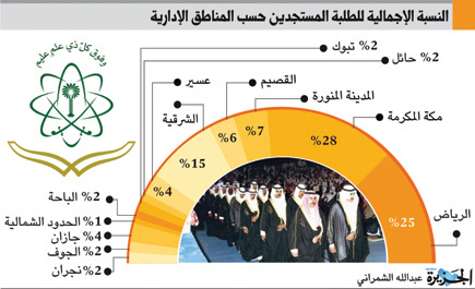 غير أن النسبة الأعلى لمجموع الطلبة المستجدين (بنين وبنات) كان في مكة المكرمة التي شكلت 28 % من المجموع الكلي للمستجدين بالتعليم العالي في المملكة كافة، تليها الرياض 25 %، ثم المنطقة الشرقية 15 %، فالمدينة المنورة 7 %، ثم القصيم وعسير وجازان على التوالي.