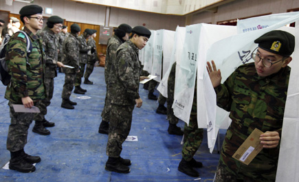 * يصطف جنود كوريون جنوبيون لكي يدلوا بتصويتهم الغيابي في الانتخابات الرئاسية في سيؤول ... رويترز