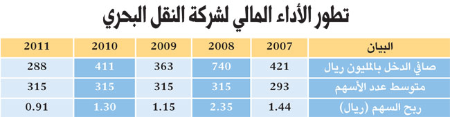شركة النقل البحري تمثل أحد الشركات التي ترتبط بسوق دولي مفتوح، ونظراً لأن الشركة تستهدف نقل الصادرات إلى خارج المملكة، وكون النفط ومنتجاته أحد أهم صادرات المملكة، فيرتبط نشاط الشركة بشكل كبير بسوق النفط الدولي وحدود التغير في أسعاره.. وتمتلك شركة النقل البحري الوطنية ميزة نسبية تتمثل في التميز النسبي للمملكة في ريادة سوق النفط كمنتج ومصدر رئيس فيه.. وبالتالي، فإن الشركة من المفترض أن تمتلك تميزاً في سوق النقل البحري، لأنه بالطبع سيتم تفضيلها عن الشركات الأخرى في نقل البترول ومنتجاته.. ورغم أن شركات البتروكيماويات أحرزت أداءً إيجابياً خلال سنوات الارتفاع في أسعار النفط، إلا إن شركة النقل البحري لم تستجيب بالقدر الإيجابي نفسه.. فرغم أن صافي ربح الشركة تحسن كثيراً في عام 2008م مع طفرة أسعار النفط (وصل إلى 740 مليون ريال)، إلا إنها لم تتحسن بالقدر المتوقع في عام 2011م، حيث لم تزد عن 288 مليون ريال، رغم أن متوسط سعر النفط في عام 2011م جاء أعلى بشكل ملحوظ عنه في عام 2008م.. بالتحديد النقل البحري نشاط خدمي، والشركة تمتلك وضعاً أقرب لاحتكار السوق المحلي، وتمتلك أسطولاً مميزاً.. وقد يفسر بعض التراجع في أداء الشركة في حرب الأسعار في سوق النقل البحري للبضائع في السعودية التي ظهرت خلال السنوات الأخيرة، وخاصة بعد انضمام المملكة لمنظمة التجارة العالمية، وخاصة أنه تم السماح للشركات الأجنبية بدخول السوق السعودية بشكل قاد إلى انخفاض تكاليف النقل البحري للبضائع.. إلا إن بعض هذا التراجع في ربحيتها لا يزال غير مبرر.