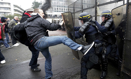 - الشرطة الفرنسية تقف أمام أحد مصانع الإطارات بعد مظاهرات من العمالة بعد قرار تخفيض العمالة في حين تشتد الاشتباكات بينهم... رويترز
