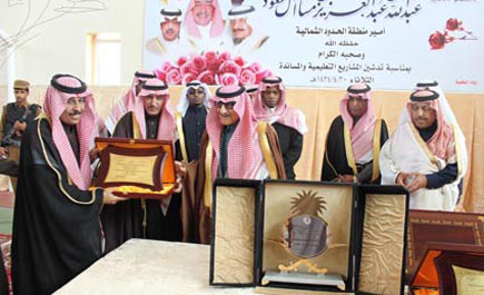 رعى صاحب السمو الأمير عبدالله بن عبدالعزيز بن مساعد، أمير منطقة الحدود الشمالية صباح أمس الثلاثاء الحفل الذي نظمته الإدارة العامة للتربية والتعليم بالمنطقة بمناسبة تدشين مشاريع تعليمية بتكلفة بلغت أكثر 670 مليون ريال . ولدى وصول سموه كان في استقباله مدير عام التربية والتعليم بالمنطقة الأستاذ عبدالرحمن الروساء. بعد ذلك قام سموه بقص الشريط وأزاح الستار عن اللوحة التذكارية للمشاريع المستلمة بالمنطقة والبالغ عددها 32 مشروعاً بتكلفة 255مليون ريال والمشاريع الجاري تنفيذها بالمنطقة، والبالغ عددها 80 مشروعاً بتكلفة أكثر من 280 مليون ريال إضافة إلى 11 مشروعاً تعليمياً جديداً من ميزانية هذا العام بتكلفة 135 مليون ريال . ثم اطلع سموه على المخططات للمشاريع المعتمدة مستمعاً إلى شرح عن هذه المشاريع. بعد ذلك شرف سموه الحفل الخطابي المعد بهذه المناسبة، و الذي تضمن كلمة لمدير عام التربية والتعليم بالمنطقة. بعد ذلك شاهد سموه والحضور عرضاً مرئياً يحكي تطور التعليم في هذا الجزء الغالي من بلادنا . بعد ذلك تفضل سمو أمير المنطقة بتكريم الجهات المتعاونة مع الإدارة، ثم تجول سموه داخل المجمع التعليمي مستمعاً إلى إيجاز عنه، بعد ذلك غادر سموه مقر الحفل .