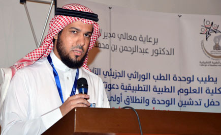 ثم تحدث الدكتور صالح العبد الهادي رئيس وحدة الطب الوراثي الجزيئي ووكيل الكلية للتطوير والجودة وقال: إن الرؤية الحقيقية لوحدة الطب الوراثي الجزيئي هي الأبداع والتميز في تقديم الفحوصات الطبية والأبحاث العلمية وبناء شراكة مجتمعية فعالة في مجال الطب الوراثي الجزيئي وأكد على أن رسالة الوحدة هي المشاركة في الارتقاء ورفع ثقافة ووعي المجتمع من خلال تقديم برامج علمية وحملات للحد من زيارة وانتشار الأمراض الوراثية في المجتمع المحلي وإجراء أبحاث علمية في مجال الطب الوراثي الجزيئي. لافتاً إلى أهم أهداف الوحدة والمتمثلة في توفير خدمات إرشاد وراثي بالإضافة إلى إعداد واستقبال العينات وإرسالها للجهات المختصة لاستكمال الفحوصات الوراثية غير المتوفرة لدى الوحدة. وكذلك المشاركة بفاعلية في خدمة وتنمية المجتمع السعودي من خلال الحملات والمحاضرات العلمية وعقد شراكة مع المراكز الصحية المختلفة لتوفير الفحوصات الوراثية اللازمة.