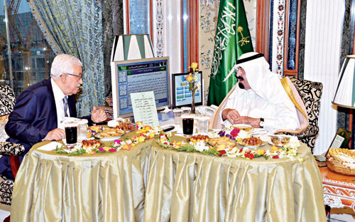 عقب ذلك جرى بحث تطورات القضية الفلسطينية والجهود المبذولة لتحقيق سلام عادل وشامل يضمن للشعب الفلسطيني حقوقه المشروعة في إقامة دولته المستقلة على ترابها الوطني، حضر الاجتماع صاحب السمو الملكي الأمير عبدالإله بن عبدالعزيز آل سعود مستشار خادم الحرمين الشريفين وصاحب السمو الملكي الأمير مقرن بن عبدالعزيز آل سعود النائب الثاني لرئيس مجلس الوزراء المستشار والمبعوث الخاص لخادم الحرمين الشريفين وصاحب السمو الأمير فيصل بن عبدالله بن محمد وزير التربية والتعليم وصاحب السمو الملكي الأمير متعب بن عبدالله بن عبدالعزيز وزير الحرس الوطني وصاحب السمو الملكي الأمير عبدالعزيز بن عبدالله بن عبدالعزيز نائب وزير الخارجية ومعالي وزير الدولة عضو مجلس الوزراء لشئون مجلس الشورى الدكتور سعود المتحمي الوزير المرافق. كما حضره من الجانب الفلسطيني معالي عضو اللجنة التنفيذي لمنظمة التحرير الفلسطينية الدكتور صائب عريقات ومعالي المستشار الدبلوماسي الأستاذ مجدي الخالدي ومعالي رئيس جهاز المخابرات العامة الأستاذ ماجد فرج ومعالي سفير فلسطين لدى المملكة جمال عبداللطيف الشوبكي، وكان قد استقبل خادم الحرمين الشريفين الملك عبدالله بن عبدالعزيز آل سعود- حفظه الله- في قصر الصفا بمكة المكرمة قبل مغرب أمس أخاه فخامة الرئيس محمود عباس رئيس دولة فلسطين والوفد المرافق له. وقد أقام خادم الحرمين الشريفين- أيده الله- مأدبة إفطار تكريماً لأخيه فخامة الرئيس الفلسطيني.