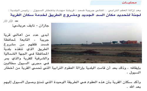 لم يمض شهر على الخطاب الذي تقدَّم به أهالي قرية جريبة الشقيري التابعة لمحافظة ضمد، لرئيس البلدية يحذِّرون فيه من إزالة العقوم الترابية المجاورة لقريتهم وتهديد السيول لهم، حتى داهمت السيول التي خلفتها الأمطار على المناطق الجبلية القرية مسببة أضراراً لمشروع البلدية الذي يتم إنشاؤه بعد أن جرفته السيول وهدمت أجزاء من أحد المنازل.