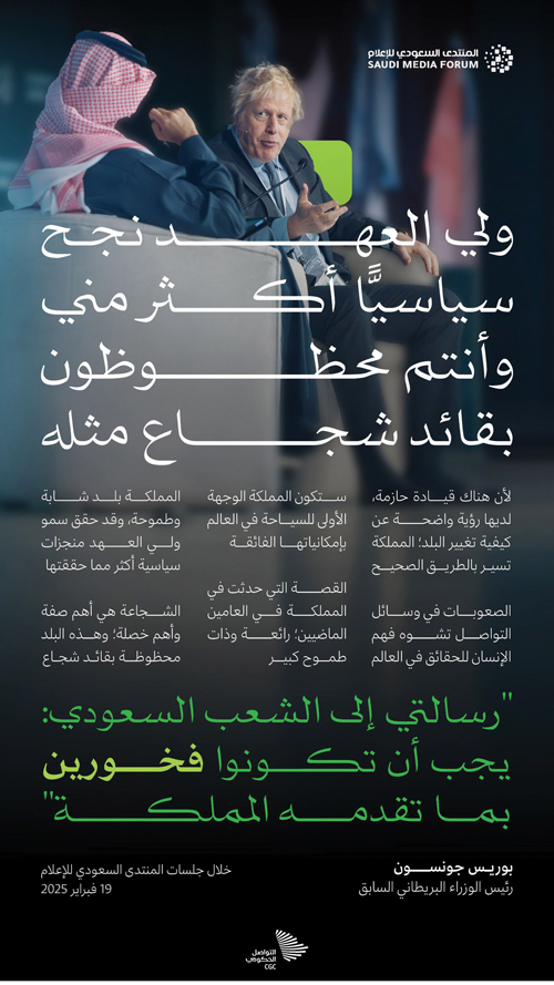 جاء ذلك خلال مشاركته في جلسة ضمن أعمال النسخة الرابعة من المنتدى السعودي للإعلام، تحت عنوان «الإعلام وصناعة شخصية بوريس جونسون السياسية»، وتناول تأثير الإعلام على مسيرته السياسية، ورؤيته للتحولات السريعة التي تشهدها المملكة، ودورها المتنامي على الساحة الدولية.