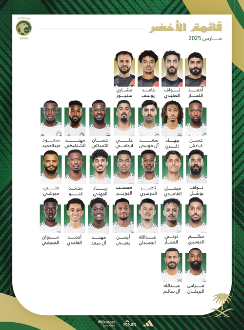 اختار الفرنسي إيرفي رينارد المدير الفني لمنتخبنا الوطني الأول قائمة من 27 لاعبا استعدادا لخوض مباراتي الجولتين السابعة والثامنة من الدور الثالث في التصفيات الآسيوية المؤهلة إلى نهائيات كأس العالم 2026، التي يواجه فيهما الأخضر منتخبي الصين واليابان.. حيث يستضيف نظيره الصيني يوم الخميس 20 من مارس الجاري في ملعب الأول بارك بجامعة الملك سعود، ثم يحل ضيفا على منتخب اليابان يوم الثلاثاء 25 من الشهر ذاته هناك في استاد سايتاما الشهير.