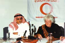 وقال في لقاء صحفي مشترك عقده أمس بمقر الجمعية مع رئيسة الاتحاد الدولي لجمعيات الصليب الأحمر والهلال الأحمر/ ان هذه الزيارة تأتي بتوجيهات من خادم الحرمين الشريفين الملك فهد بن عبد العزيز آل سعود وتقضي بجمع المعونات الإغاثية اللازمة وفتح المجال أمام الأطباء والراغبين للعمل مدة قصيرة لعلاج اللاجئين واعطائهم التعليمات الضرورية تقديرا لحاجتهم الماسة لذلك.