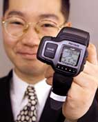 كيموموري يوزاروا موظف العلاقات العامة بشركة كاسيو يعرض اول ساعة يد من نوعها تحدد موقعك في العالم وهي تعمل بنظام Gps او التحديد العالمي للموقع, الساعة تتلقى معلوماتها من 27 قمرا اصطناعيا امريكيا لتحديد المكان ويصل وزنها الى 138جم وسيتم تحديد ثمنها قبل عرضها للبيع في اليابان ثم عبر البحار في يونيه القادم في الصورة توضح الساعة ان حاملها على بعد 2,4 كيلومتر من طوكيو.
