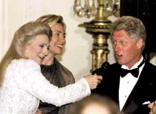 الرئيس الامريكي بيل كلينتون يؤدي مقطعاً من تمثيلية الرشاقة المدهشة مع المغنية جودي كولينز (يسار) ومعهم هيلاري كلينتون وذلك اثناء حفل العشاء الذي اقيم بالبيت الابيض يوم الثلاثاء الماضي على شرف ارباد جونز رئيس جمهورية المجر وزوجته.