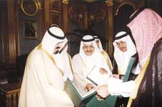 استقبل صاحب السمو الملكي الأمير عبدالله بن عبدالعزيز نائب خادم الحرمين الشريفين في مكتب سموه بالديوان الملكي بقصر السلام أمس صاحب السمو الملكي الأمير نايف بن عبدالعزيز وزير الداخلية الرئيس الفخري لمجلس وزراء الداخلية العرب وأصحاب المعالي وزراء الداخلية والعدل العرب وهم معالي وزير الداخلية الأردني نايف سعود القاضي ومعالي وزير الداخلية والجماعات المحلية والبيئة الجزائري عبدالمالك سلال ومعالي وزير العدل بالمملكة العربية السعودية الدكتور عبدالله بن محمد آل الشيخ ومعالي وزير الداخلية السوري الدكتور محمد حربة ومعالي وزير العدل السوري حسين حسون ومعالي وزير العدل العراقي شبيب لازم المالكي ومعالي وزير الداخلية المصري اللواء حبيب إبراهيم العادلي ومعالي وزير العدل المغربي عمر عزيمان ومساعد وزير العدل المصري سري محمود صيام الذين يعقدون الاجتماع الأول للجنة الوزارية المشتركة المنبثقة عن مجلسي وزراء الداخلية والعدل العرب والمعنية بايجاد وإقرار الآلية المناسبة لتنفيذ الاتفاقية العربية لمكافحة الارهاب.