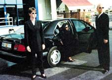 أليسون (يسار) وسارة (يمين) امرأتان من حراسة الشخصيات تعملان بشركة الخدمات الأمنية الأوروبية (EES) تقفان في وضع تأهب ومراقبة عند خروج إحدى الزبائن من السيدات العربيات من الخليج من السيارة في دبي, نوع جديد من الحارسات الخصوصيات للنساء الخليجيات الأثرياء ازدهر خاصة في البلدان التي تحافظ على التقاليد.