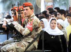 بعض افراد الشرطة الفلسطينية الخاصة يركبون في مؤخرة سيارة جيب ويمرون بالمشاة المصطفين في الشارع لمشاهدة التجمع الكبير للاحتفال بالذكرى الحادية عشرة لاعلان الاستقلال.