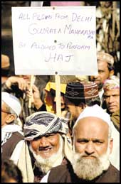 مسلمون هنود يحملون راية اثناء تظاهرة بالقرب من مبنى البرلمان احتجاجا على سياسة الحكومة في معالجة موضوع الذهاب لاداء فريضة حج هذا العام فعلى الرغم من ان المملكة العربية السعودية رفعت نسبة الحجاج الهنود ليصل العدد الى 100 الف حاج لهذا العام إلا أن آلاف المسلمين الهنود لم يتم انهاء موضوع الاوراق والمستندات الخاصة بهم على يد السلطات الهندية.