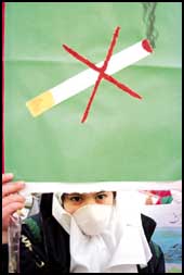 طالبة إيرانية تحمل ملصق مكافحة التدخين أثناء تظاهرة في إيران بمناسبة اليوم الخالي من التلوث في العاصمة الإيرانية التي تعد من بين أشد المدن تلوثاً في العالم وقد طلب من السائقين في هذا اليوم إيقاف محركات سياراتهم لمدة ثلاث دقائق.
