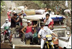 سكان قرية ماساراواج الفلبينية يقومون بالرحيل عن القرية في سيارات جيب وعلى دراجات نارية بعد الثوران العنيف لبركان مايون حيث تخشى السلطات المسؤولة ان تتحول أطنان المواد البركانية على منحدرات جبل مايون الى انهيارات بركانية مدمرة في حالة سقوط الأمطار الغزيرة.