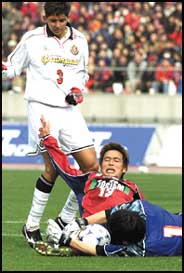 حارس ناجويا جرامبس يقطع الطريق على مهاجم فريق كاشيما انتلرز خلال اللقاء الافتتاحي للدوري الياباني أمس الأول وانتهت المباراة لصالح كاشيما 1/صفر.
