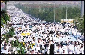 أعلن صاحب السمو الملكي الأمير عبدالمجيد بن عبدالعزيز أمير منطقة مكة المكرمة ورئيس لجنة الحج المركزية ان نفرة الحجاج من مزدلفة الى منى تمت ولله الحمد والمنةّ بكل نجاح وفي فترة زمنية وجيزة وذلك بفضل الله أولاً ثم بفضل الجهود التي سخرتها كافة الأجهزة الحكومية المعنية بشؤون الحج والحجاج بتوجيه ومتابعة شخصية من خادم الحرمين الشريفين الملك فهد بن عبدالعزيز آل سعود وسمو ولي عهده الأمين حفظهما الله .وأكد سموه لوكالة الأنباء السعودية ان الحركة المرورية اتسمت بالمرونة والانسيابية ولم تكن هناك أي اختناقات مرورية تذكر وان جميع الخطط الأمنية والخطط الخاصة بالقطاعات الأخرى نفذت على الوجه المطلوب وجميع الأمور تسير على ما يرام ووفق ما خطط لها.وأوضح سمو أمير منطقة مكة المكرمة ورئيس لجنة الحج المركزية ان جميع الخدمات مكتملة ومتوفرة بالشكل المطلوب الذي يغطي احتياجات ضيوف الرحمن ويلبي طلباتهم ورغباتهم.وأثنى سموه على الجهود التي بذلتها وتبذلها القطاعات والأجهزة الأمنية لخدمة وراحة حجاج بيت الله الحرام وتقدم بالشكر والتقدير لهم على الجهود التي بذلوها مما أسهم في تقديم الخدمات للحجاج والتيسير عليهم لاداء مناسكهم في سهولة ويسر.وبين سموه أن الحالة الأمنية والصحية بين حجاج بيت الله الحرام ممتازة وان جميع التقارير الواردة تؤكد خلو هذا الموسم من جميع الأوبئة والأمراض كما أنه لم تكن هناك حوادث تذكر والحالة الأمنية ممتازة ولم يحدث أي شيء يعكر صفو الحجيج.وأشاد سموه بالمشروعات الحيوية التي نفذتها حكومة المملكة العربية السعودية في المشاعر المقدسة وبما حققته هذه المشروعات من أهداف سامية في تسهيل وتيسير أداء الركن الخامس من أركان الاسلام على حجاج بيت الله الحرام ومن ذلك مشروع الخيام المطورة الذي تم تنفيذه في مشعر منى الذي يشتمل على كافة وسائل الراحة والسلامة والأمن والأمان والسكن المريح لحجاج بيت الله الحرام.وفي ختام تصريحه أشاد سموه بما يوليه خادم الحرمين الشريفين وسمو ولي عهده الأمين حفظهما الله من عناية ورعاية واهتمام لضيوف الرحمن وحرصهما الدائم على راحتهم وتحقيق ما يمكنهم من أداء شعائرهم بكل يسر وأمان وتوفير أفضل الخدمات لهم وتأكيدهما الدائم على كافة المسؤولين بالجهات المعنية باعداد الخطط والبرامج التي تحقق المزيد من الراحة والاطمئنان لضيوف الرحمن.وتمنى سموه ان يكتمل موسم حج هذا العام بنفس النجاح الذي تحقق في خططه الأولى وان يعود ضيوف الرحمن إلى أوطانهم سالمين غانمين بعد أن منّ الله عليهم بأداء هذه الفريضة.