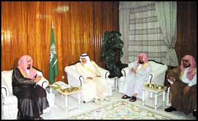 كما استقبل صاحب السمو الملكي الامير نايف مساء امس بمقر الوزارة في العزيزية بمكة المكرمة معالي وزير الحج اياد بن امين مدني وكبار المسؤولين بوزارة الحج ورؤساء واعضاء مجالس ادارة مؤسسات ارباب الطوائف من مطوفين ووكلاء وادلاء وزمازمة ورئيس النقابة العامة للسيارات,