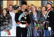 ملكة الدنمارك الملكة ماجريت الثانية من اليمين تشاهد الالعاب النارية اثناء حضور مهرجان بالمسرح الملكي بمناسبة ذكرى ميلادها الستين ومعها الاميرة الكسندرا يسار والامير هنريك والامير جوتشيم يمين ، وحضر هذه الاحتفالات بعض اعضاء العائلات الملكية الاوروبية.