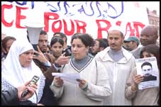 نورية حملاوى (وسط) شقيقة الجزائري القتيل رياض حملاوى تقف بجوار والدتها (يسار) اثناء كلمتها امام بضعة آلاف من المتظاهرين بالقرب من مبنى مجلس المدينة حيث احتجوا على مقتل رياض برصاص شرطي فرنسي وقد جري ايقاف الشرطي عن عمله وهو رهن الحبس الوقائي اثناء التحقيق بهذا الحادث.