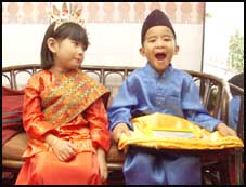 الطفل موحد حارث (6 سنوات) يتثاءب بجوار زميلته ناديا ارفينا (5 سنوات) اثناء انتظارهما لتقديم شيك مالي خلال حفل عشاء وهما مرتديان الزي الوطني الاسلامي حيث يخصص الشيك لدعم عملية صيانة تراث الملايو والحفاظ على اساليب الطبخ الاسلامي في سنغافورة.