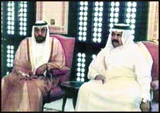 واستقبل الشيخ حمد بن خليفة آل ثاني أمير دولة قطر بمقر اقامته في مسقط أمس الشيخ خليفة بن زايد آل نهيان ولي عهد أبوظبي نائب القائد الأعلى للقوات المسلحة بدولة الامارات العربية المتحدة.