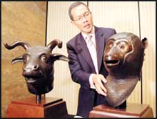 صورة ارشيفية لرئيس شركة كريستيز للمزادات انطوني لين وهو يعرض امام الصحافة وعدسات التلفزيون رأسي قرد وثور مصنوعات من البرونز في هونج كونج متحدياً حكومة بكين التي تقول ان الرأسين قد سرقا من القصر الامبراطوري منذ 140 عاماً وقد وصل سعر بيع هذين الرأسين الى 2,4 مليون دولار وهو مبلغ اعلى بكثير مما توقعته شركة المزادات.