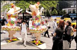 حشود المارة تسير وسط بقرتين مصنوعتين من الزجاج الليفي فايبر جلاس ومطليتين بالألوان حيث بدأ مهرجان الأبقار في نيويورك لعام 2000، وسوف يتم وضع 500 بقرة من الزجاج الليفي في الأماكن والميادين العامة في أحياء مدينة نيويورك وأقسامها الخمسة.