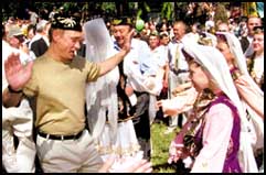 الرئيس الروسي فلاديمير بوتين يرقص مع فرقه كازانية يرتدي افرادها الزي التقليدي اثناء الاحتفال بيوم العطلة السنوي في تاترستان، وقد زار بوتين كازان للمشاركة في الاحتفال.