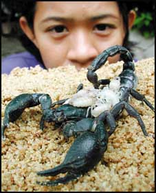 زائر لحديقة حيوان سريراشا يشاهد عقربا وعلى ظهرها اطفالها العشرة المحميين بذيلها الذي يحتوي على سم قاتل, ويتم في الحديقة توالد العقارب لتباع بعد ذلك مقلية مقابل دولارين ونصف وتعتبر العقارب المقلية أكلة شعبية عند بعض المجتمعات الآسيوية لاعتقادهم انها تقوي الصحة وتزيد مناعة الجسم.