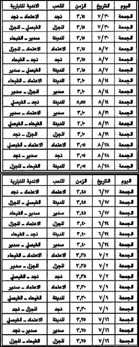 وسيبدأ دوري اندية الدرجة الثالثة في كرة القدم اعتبارا من يوم الجمعة الموافق 17/6/1421ه اما دوري درجة الشباب فسيبدأ يوم الاربعاء الموافق 15/6/1421ه والناشئين اعتبارا من يوم الاحد الموافق 19/6/1421ه, وبالنسبة لمباريات التصفيات التمهيدية لمسابقة كأس سموولي العهد لكرة القدم لاندية محافظة المجمعة فستنطلق يوم الجمعة الموافق 23/7/1421ه حيث سيلعب فريق المحمل مع فريق سدير على ملعب المحمل بثادق,, ويلعب الاعتماد مع المجزل على ملعب نادي الاعتماد بروضة سدير ويلعب الفيصلي مع الفيحاء على ملعب مدينة الامير سلمان بن عبدالعزيز الرياضية بمحافظة المجمعة,, وفي الجولة الثانية يلعب الفائز من المحمل وسدير مع الفائز من الاعتماد والمجزل يوم الاثنين 10/8/1421ه على ملعب الفائز من المحمل وسدير بينما يلعب الفائز من الفيصلي والفيحاء مع نجد على ملعب مدينة الامير سلمان بن عبدالعزيز والفائز في هاتين المبارتين يلعب على المباراة النهائية لاندية المحافظة يوم الاثنين 1/9/1421ه على ملعب مدينة الامير سلمان بن عبدالعزيز الرياضية بمحافظة المجمعة, هذا وفيما يلي جدول مباريات دوري اندية الدرجة الثالثة لاندية محافظة المجمعة والذي جاء على النحو التالي: