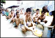 مئات السجناء يصطفون للحصول على حصصهم من الطعام,, الذي يتكون من الأرز والسمك المجفف في سجن بانكوك المزدحم، حيث يقضي ما يقارب 6200 شخص احكاماً بالسجن في جرائم ذات علاقة بالمخدرات, وتشير الاحصائيات إلى وجود أكثر من 200,000 سجين في سجونها ال133 على مستوى البلاد, وتفكر الحكومة في ايجاد مشروع لتشغيل هؤلاء المساجين في أعمال بالمناطق النائية لدعم الاقتصاد,