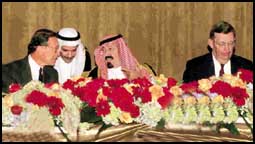 في حفل العشاء الذي اقامه مجلس الاعمال السعودي الامريكي بتعاون مع جمعية السياسة الخارجية ومجلس الاعمال للتفاهم الدولي في الولايات المتحدة الامريكية على شرف صاحب السمو الملكي الامير عبدالله بن عبدالعزيز ولي العهد ونائب رئيس مجلس الوزراء ورئيس الحرس الوطني مساء أول أمس القى صاحب السمو الملكي الامير عبدالله كلمة نوه فيها بالعلاقات السعودية الامريكية التي يعود تاريخها الى مطلع العقد الثالث من هذا القرن عندما وافق الملك عبدالعزيز على اعطاء شركة ستنادر اويل الأمريكية امتيازات بالتنقيب عن النفط في المملكة وتوطدت العلاقة خلال الحرب العالمية الثانية عندما التقى الملك عبدالعزيز بالرئيس الامريكي السابق روزفلت عام 1945م.