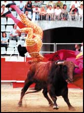 مصارع الثيران الأسباني رويز مانويل يطير في الهواء بعد أن باغته الثور الهائج بضربة غير متوقعة ولكن المصارع لم يصب بأي أذى يعيقه من متابعة المواجهة العنيفة أمام آلاف المتفرجين على حلبة مونومينتال في برشلونة.