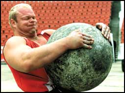 السويدي ماغنوس ساموليسن يحمل كرة حجرية يبلغ وزنها 160 كجم وذلك خلال مشاركته في منافسات البطولة التي تحمل اسم أقوى رجل في العالم التي تجري فعالياتها في رومانيا بمشاركة العديد من أبطال اللعبة.