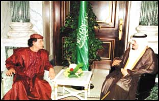 وصل إلى الرياض أمس فخامة الأخ قائد الثورة العقيد معمر القذافي في زيارة رسمية للمملكة,, وكان خادم الحرمين الشريفين الملك فهد بن عبدالعزيز آل سعود في استقبال فخامته في الديوان الملكي بقصر اليمامة.