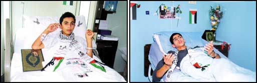الجزيرة تواجدت في غرفة البطل أمجد جمال العكاوي الذي اصيب بعدة طلقات نارية في جسمه بعد ان رفع العلم الفلسطيني فوق قبة الصخرة حيث يرقد الآن في مستشفى الملك فهد بجدة.