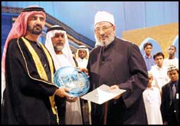 العالم الاسلامي الشيخ يوسف القرضاوي يتسلم جائزة القرآن الكريم من الشيخ محمد بن راشد المكتوم وذلك ضمن فعاليات مسابقة دبي الدولية للقرآن بوصفه الشخصية الاسلامية للعام 2000م.
