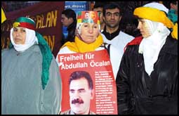 نساء كرديات بلباسهن التقليدي يشاركن في تظاهرة بمدينة برلين حاملات لافتات تطالب بالافراج عن الزعيم الكردي عبدالله اوجلان والاحتجاج على الظروف السيئة والحالة المزرية للسجون التركية