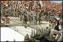 واظهرت المشاهد التي بثها التلفزيون المحلي الذي كان ينقل المباراة ان اعمال شغب حصلت في اعلى مدرجات الاستاد خلف احد المرميين ادت الى تدافع العديد من الاشخاص نحو السياج الذي يفصل الجمهور عن ارض الملعب مما ادى الى انهياره.