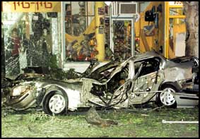 وقال شاهد عيان للإذاعة ان الناس في حالة فزع وقد تحطمت واجهات المتاجر وتناثرت في كل مكان والدخان الأسود يغطى كل شيء.