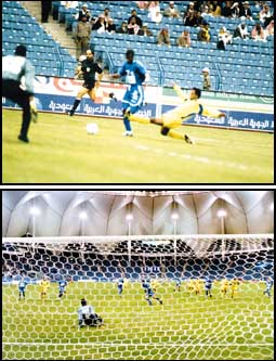 وبعد مضي 27 دقيقة انطلق الدوخي بكرة ناحية اليمين ودخل المنطقة لينقض عليه الشويع من الخلف ويعيقه ليحتسب السويل ضربة جزاء صريحة تقدم لها الكاتو ووضعها على يسار الخوجلي كهدف أول,, ووسط الارتباك النصراوي بعد الهدف نجح الهلال في اضافة هدف ثانٍ في ظرف دقيقة واحدة وبواسطة الكاتو ايضاً.