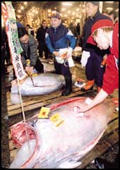 رواد سوق الأسماك المركزي في طوكيو يشاهدون سكة التونة الزرقاء التي يبلغ وزنها 202 كجم وبيعت في المزاد بسعر خيالي وصل الى 173 ألف دولار وهي تجارة رابحة خصوصاً وان المطاعم تقدم هذا النوع من الأسماك بأسعار باهظة نظراً لندرة هذا النوع من الأسماك.