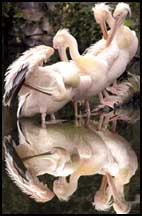 أربعة من طيور البجع الوردي اللون تنظف ريشها بالقرب من بحيرة بحديقة فرانكفورت للحيوانات بينما تنعكس صورتهم على مياه البحيرة في منظر خلاب.