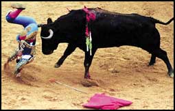 مصارع الثيران الإسباني خوليان لوبيز يتلقى ضربة من الثور الهائج الذي باغته فجأة على حلبة بلازادي تاروس في كولمبيا ولم يصب المصارع بإصابات خطرة في هذه المواجهة التي تمت خلال هذا المهرجان السنوي لمصارعة الثيران.