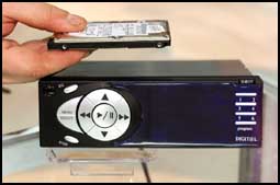 رئيس شركة SSI الامريكية يحمل محرك قرص صلب متحرك بسعة 20 جيجابايت وهو من النوع الذي يثبت في السيارة وذلك خلال فعاليات معرض لاس فيغاس للالكترونيات ويستوعب المحرك ما مساحته 600 قرص أغان نوعية MP3 وكذلك يمكن للجهاز ان يشعل اقراص الCD وMP3 العادية.