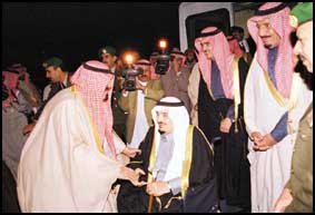 وقد وصل في معية خادم الحرمين الشريفين صاحب السمو الملكي الأمير عبدالرحمن بن عبدالعزيز نائب وزير الدفاع والطيران والمفتش العام وصاحب السمو الملكي الأمير نايف بن عبدالعزيز وزير الداخلية وصاحب السمو الملكي الأمير سعود بن فهد بن عبدالعزيز نائب رئيس الاستخبارات العامة وصاحب السمو الملكي الأمير عبدالعزيز بن فهد بن عبدالعزيز وزير الدولة وعضو مجلس الوزراء ورئيس ديوان رئاسة مجلس الوزراء وصاحب السمو الملكي الأمير نواف بن فيصل بن فهد بن عبدالعزيز نائب الرئيس العام لرعاية الشباب ومعالي رئيس الديوان الملكي الأستاذ محمد النويصر ومعالي وزير الدولة عضو مجلس الوزراء الدكتور عبدالعزيز الخويطر ومعالي المستشار بالديوان الملكي الأستاذ علي بن حسن الشاعر ومعالي نائب رئيس المراسم الملكية الاستاذ منصور الخريجي ومعالي نائب رئيس الشؤون الخاصة الملكية الأستاذ سعد بن عمار وقائد الحرس الملكي الفريق أول ركن عبدالله النملة ونائب رئيس المكتب الخاص لخادم الحرمين الشريفين الأستاذ سليمان بن الأمير.