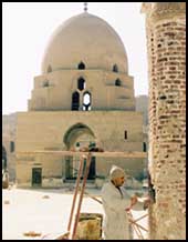 عامل مصري يعمل في ترميم مسجد ابن طولون الذي يبلغ عمره أكثر من 1120 سنة ويعد أحد أبرز الآثار الاسلامية التي بقيت في مصر حتى الآن.