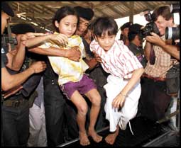 رجال الشرطة وعدد كبير من المصورين يحيطون بالتوأمين التايلنديين لوثر وجوني اللذين يتزعمان عصابة من الثوار معروفة باسم حركة كارن .
