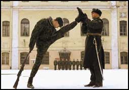 ضابط روسي يساعد أحد الجنود من وحدة حرس الشرف أثناء التدريبات بمدينة سان بيترسبيرغ وقد تأسست هذه الوحدة قبل 40 عاماً وتضم اكثر من 75 جندياً وضابطاً.